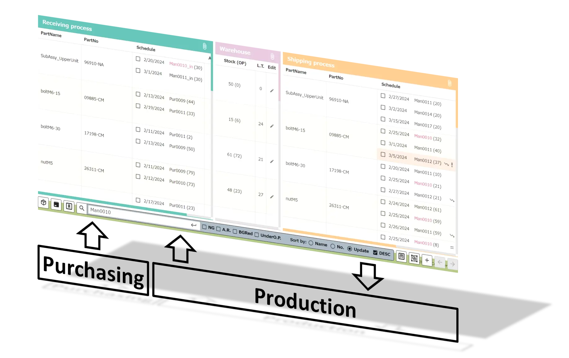 生産の計画が決まった段階で、その生産に使う部品と数量、その生産で製造されるSubAssyと数量をcsv出力して、入出庫予定をそれぞれ入れることで、履歴が残るだけでなく、 有効在庫不足、発注が必要か否かがすぐにわかり、またそれをリアルタイムに共有することが可能です。