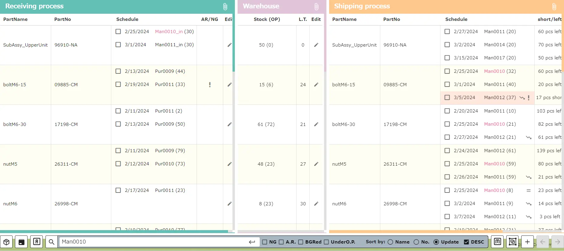 生産管理番号「Man0010」を例に説明します。 「96910-NA」というSubAssyの入庫予定を「Man0010_in」という管理番号で、2/25に30個入庫する予定を入れました。 また、「Man0010」という管理番号で「96910-NA」の生産に使う部品の出庫予定を2/25にいくつか入れました。 同一の管理番号で入出庫予定を混ぜていれることはできませんが、「Man0010」という同じ文字列を入出庫予定の管理番号に含めることで、 SubAssyの生産とその生産に引き当てられた部品を簡単に検索することが可能です。
